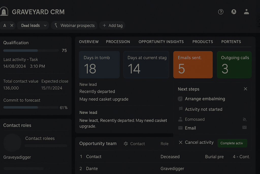 Designed for small businesses, medium-sized teams, and full-blown corporate crypts, Graveyard CRM offers powerful tools for lead management, sales automation, and customer lifecycle tracking. Seamlessly integrated with all your favourite UK systems (and some you’d thought extinct), it supports GDPR-noncompliant hauntings, multi-channel spirit summoning, and intuitive pipeline visuals that make Salesforce look positively mortal. It’s not just a CRM — it’s your last CRM.